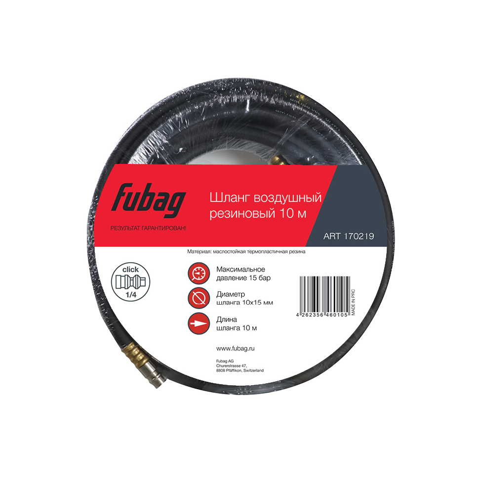 Характеристики Шланг для компрессора 10м FUBAG 170219 (15 бар, 10х15мм, с фитингами рапид, маслостойкая резина)