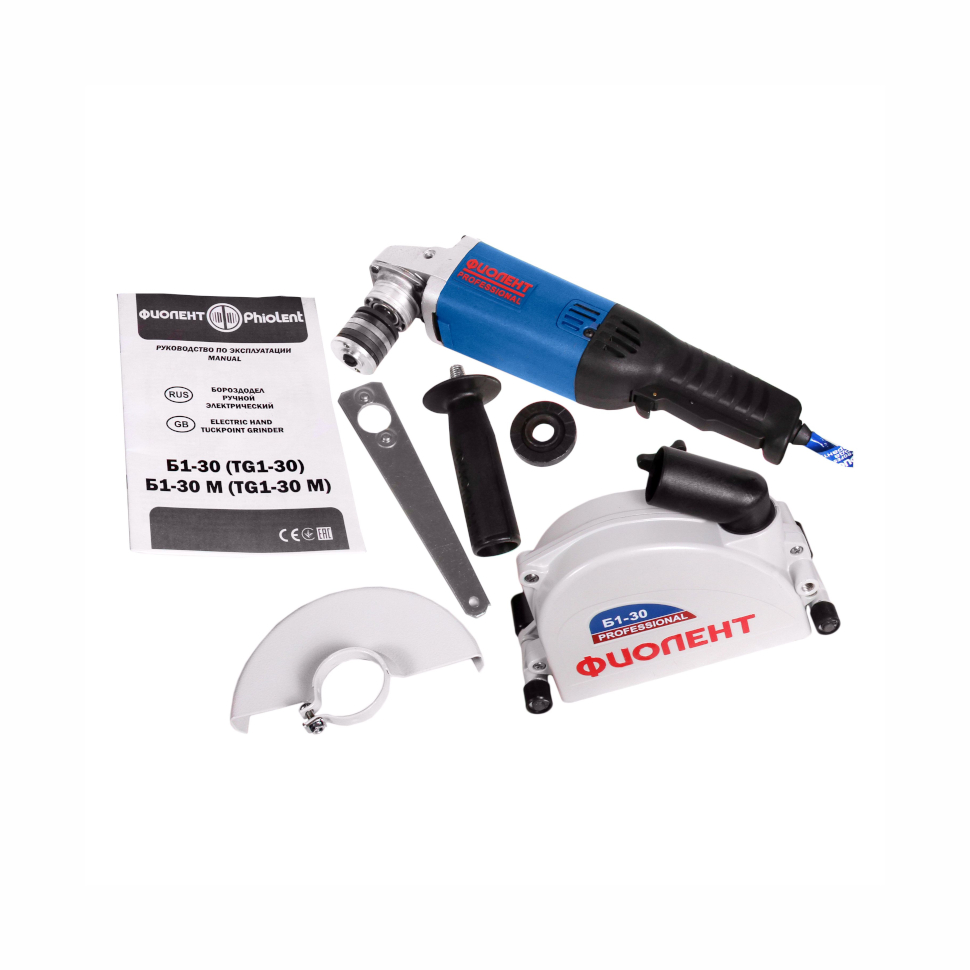 Штроборез Фиолент Б1-30. Дополнительная ручка. Защитный кожух. Гайка. Ключ. Руководство по эксплуатации. Коробка. |