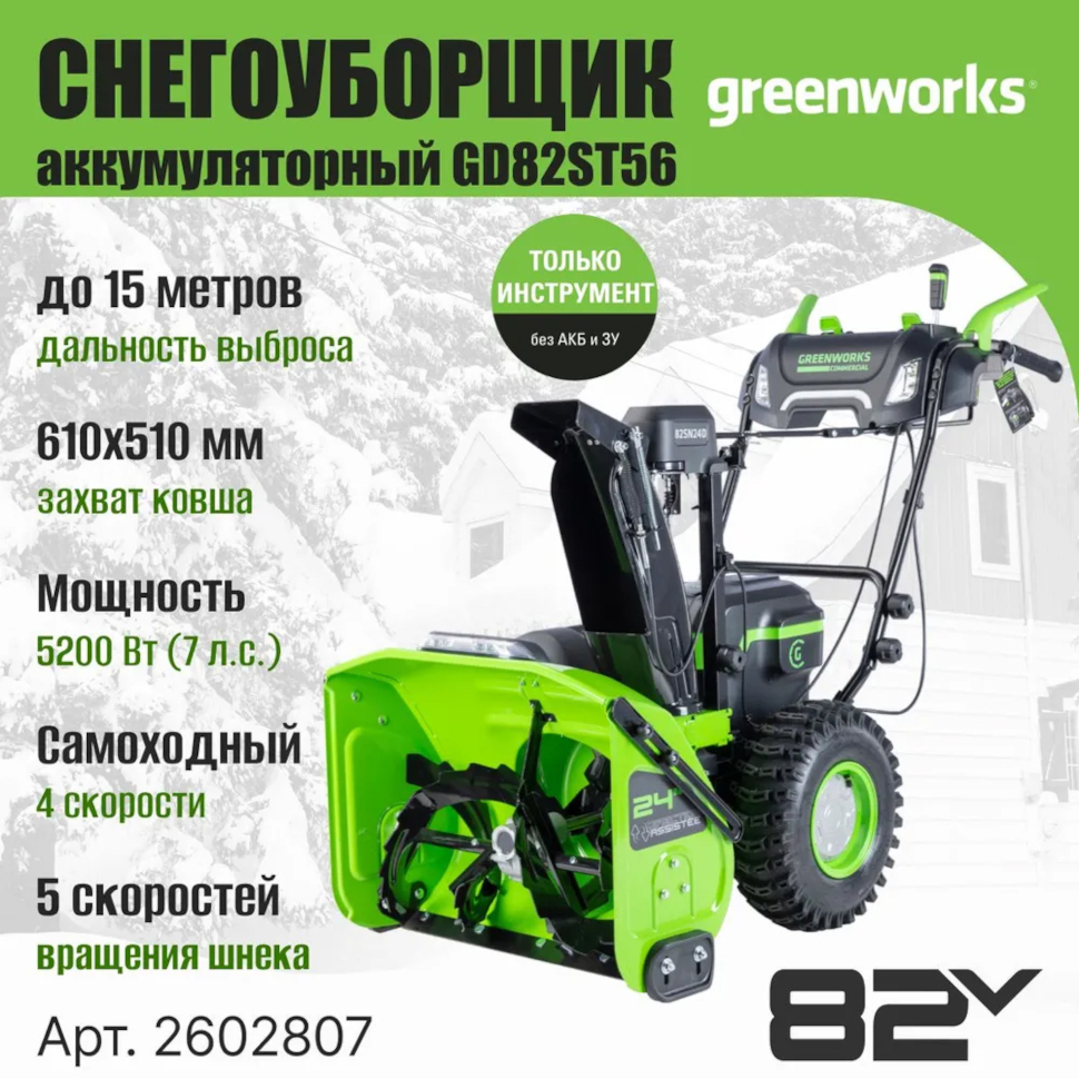 Характеристики Аккумуляторный снегоуборщик Greenworks GD82ST56 (82V, 61см, самоходный, бесщ., без АКБ и ЗУ) 2602807