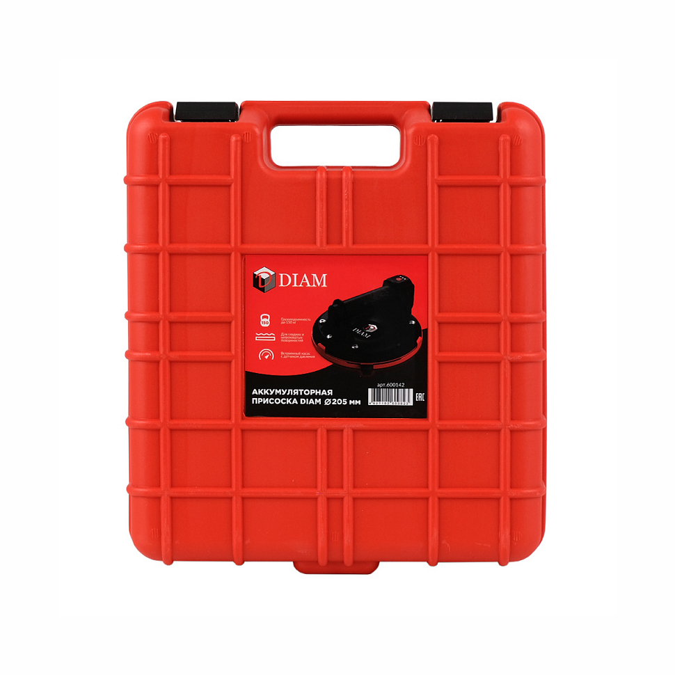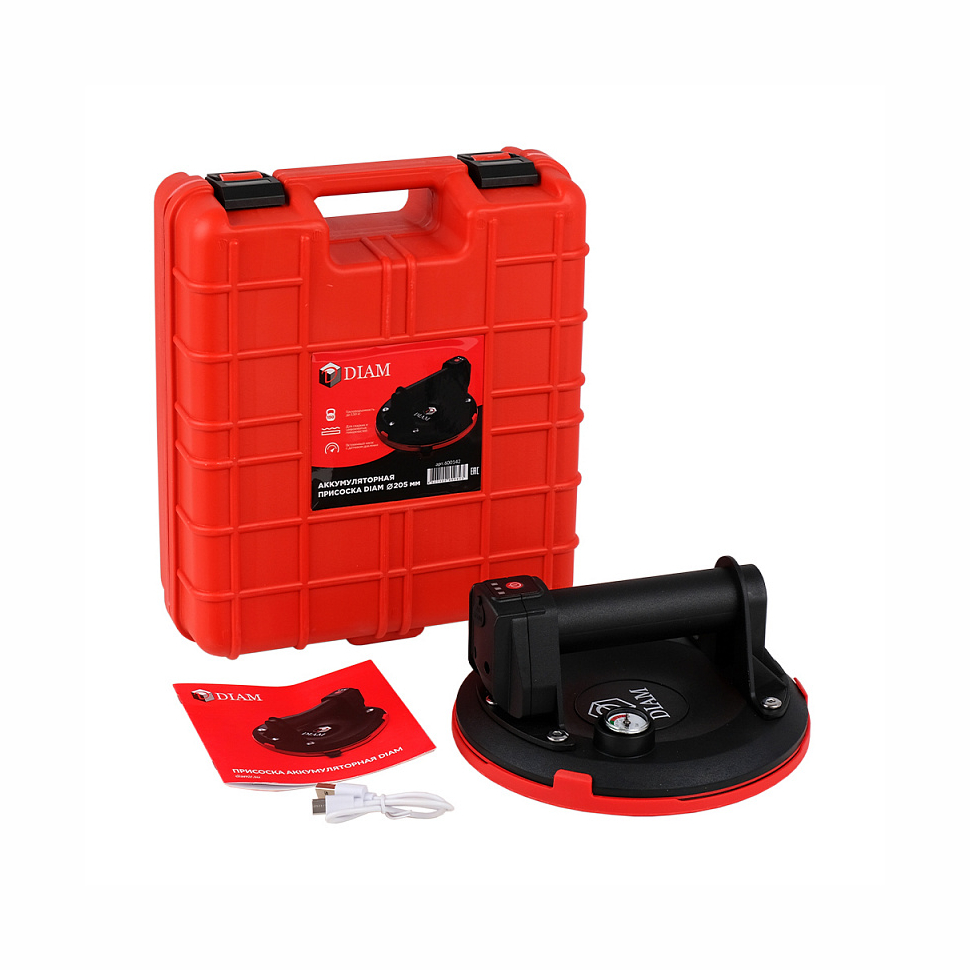 Присоска вакуумная аккумуляторная DIAM 205 мм с манометром (600142). Провод для зарядки. Инструкция по эксплуатации. Кейс. |