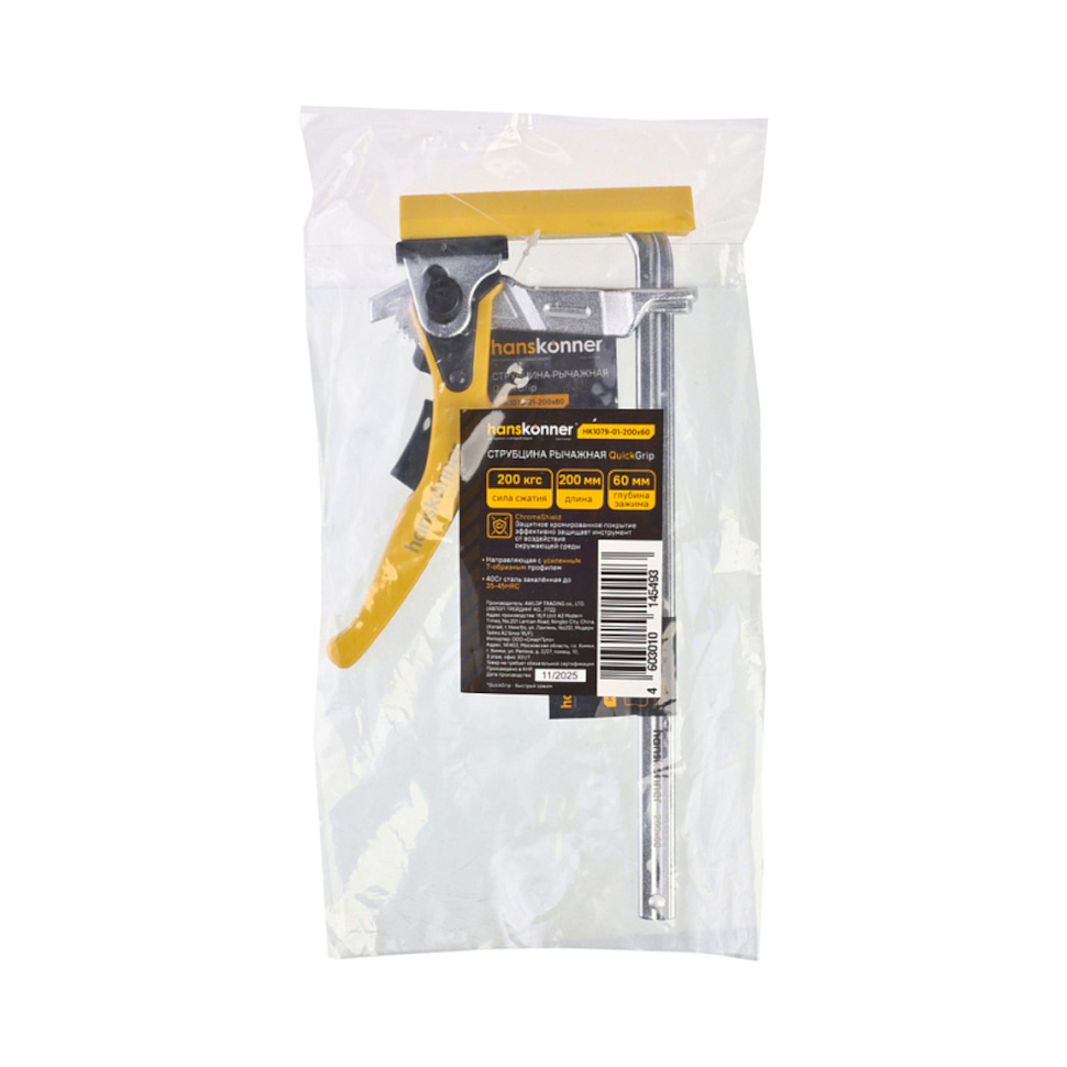 Характеристики Струбцина 200x60мм, 40CR сталь, хромированная Hanskonner (HK1079-01-200x60)