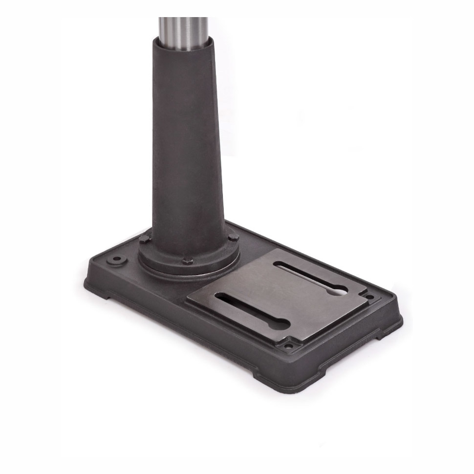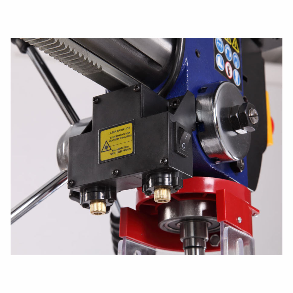 - Станок оснащен тройной рукояткой подачи для плавного сверления, шкалой глубины, лазерным указателем для точного позиционирования и зубчатой рейкой на колонне диаметром 73 мм.