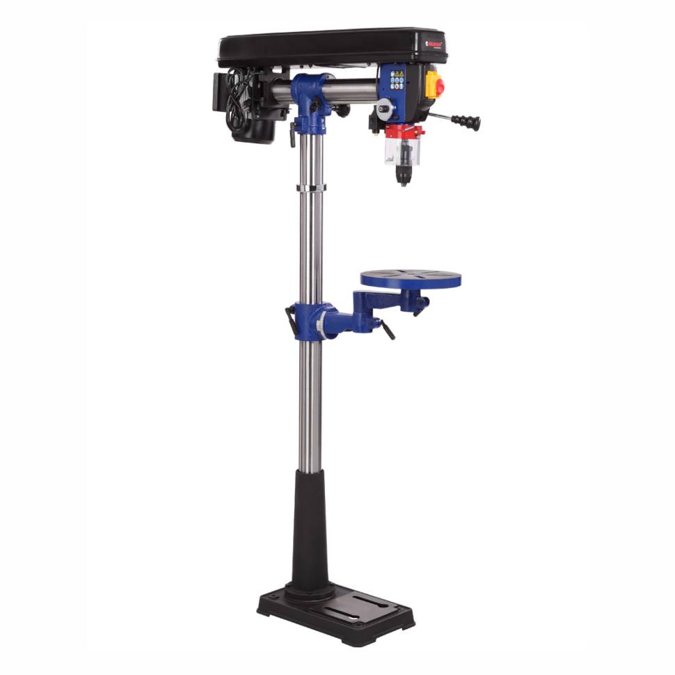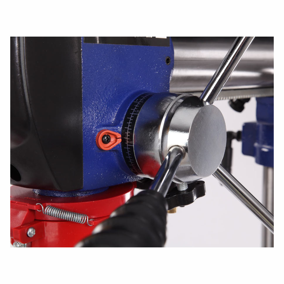 Модель обеспечивает регулировку положения сверлильной головки по высоте, горизонтали (вылет шпинделя до 430 мм) и вращение вокруг вертикальной оси на 360 градусов, а также наклон вправо на 45 градусов и влево на 90 градусов. Рабочий стол (300x300 мм) вращается вокруг своей оси и наклоняется от -45 до +45 градусов.