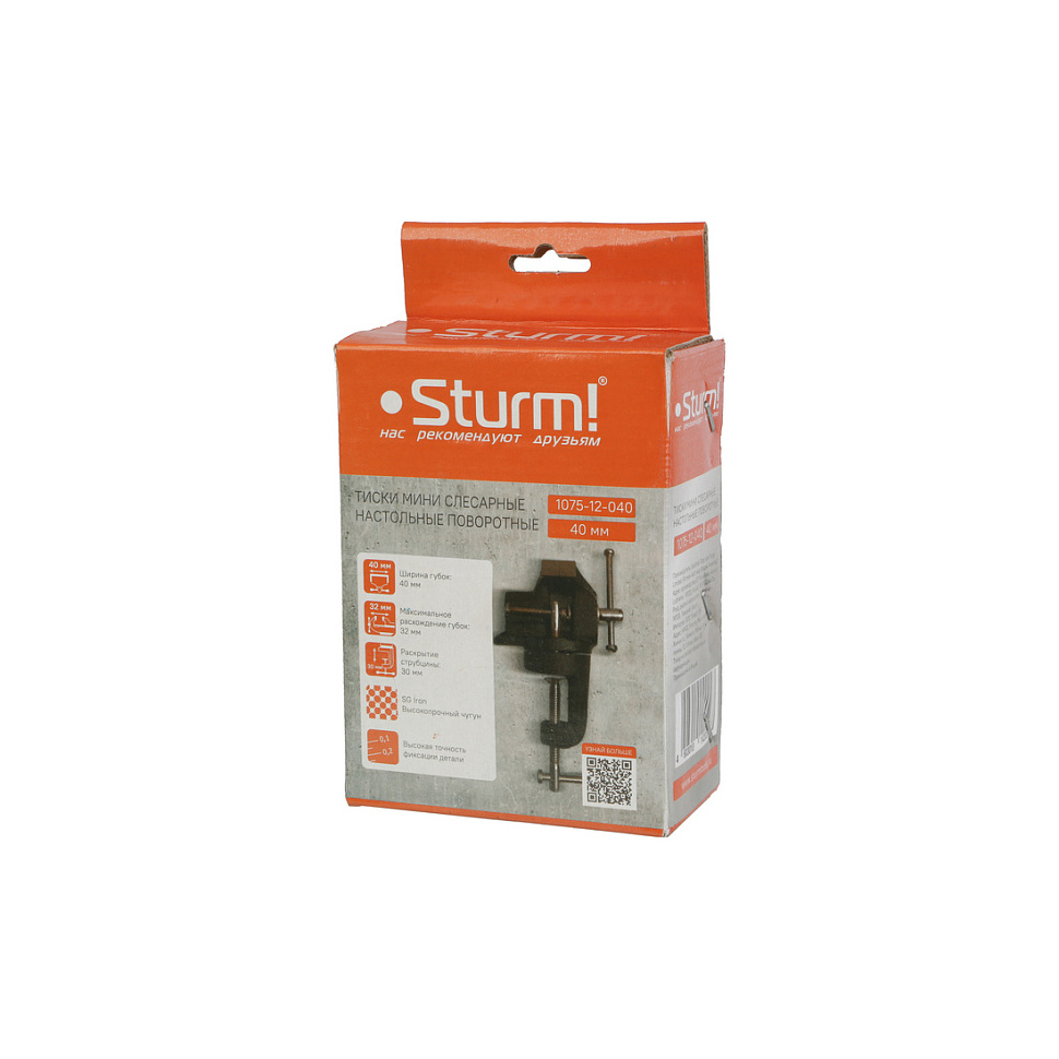 Тиски слесарные мини 40мм, поворотные, на струбцине Sturm (1075-12-040). Коробка. |