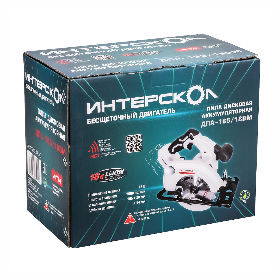 Пила циркулярная аккумуляторная Интерскол ДПА-165/18ВМ (762.0.0.70). Диск пильный (установлен на пиле). Линейка направляющая. Ключ S6. Руководство по эксплуатации и инструкция по безопасности. Гарантийный талон. Коробка. |