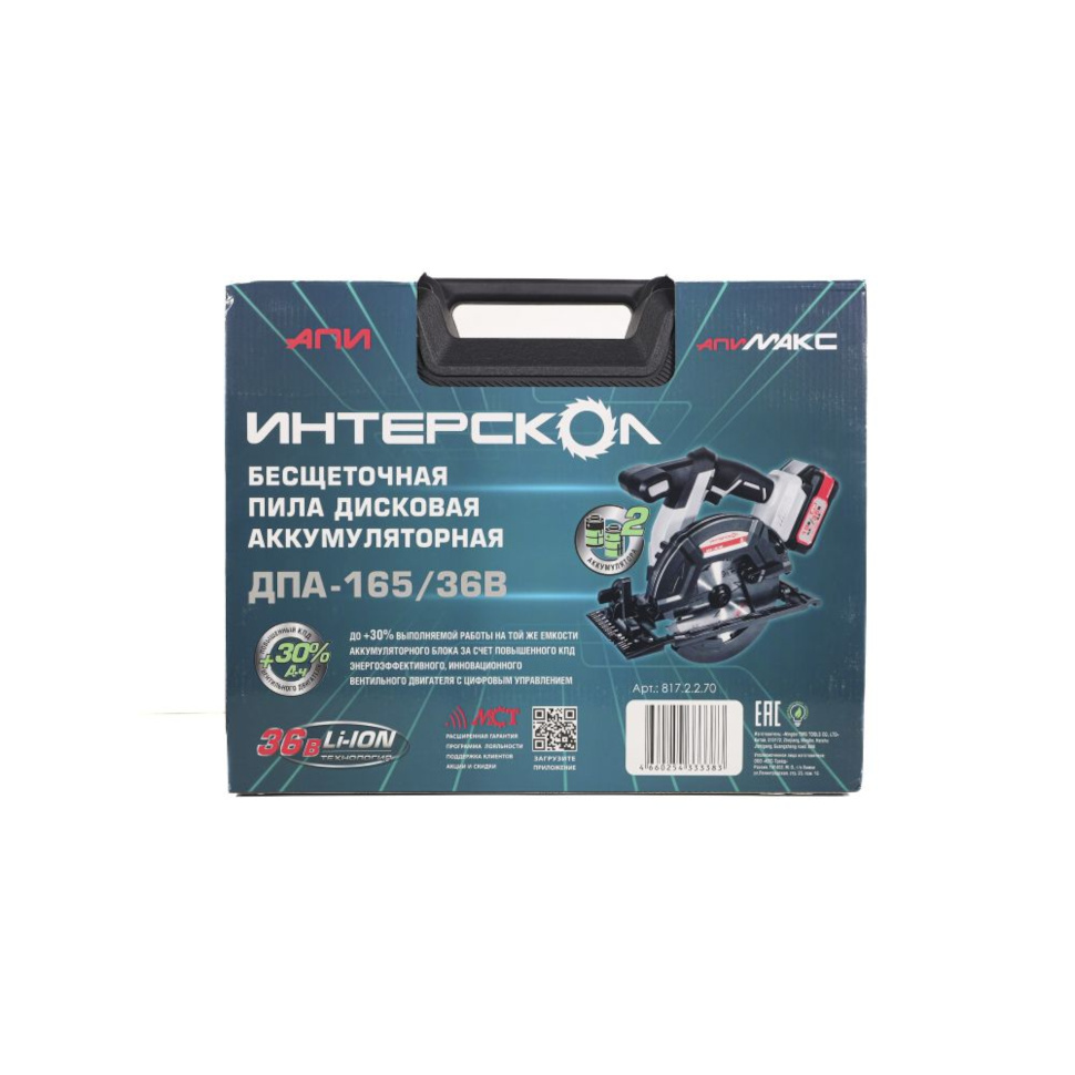 Характеристики Пила циркулярная аккумуляторная Интерскол ДПА-165/36В (817.2.2.70) (36В, бесщ., АКБ 2Ач и ЗУ, кейс)