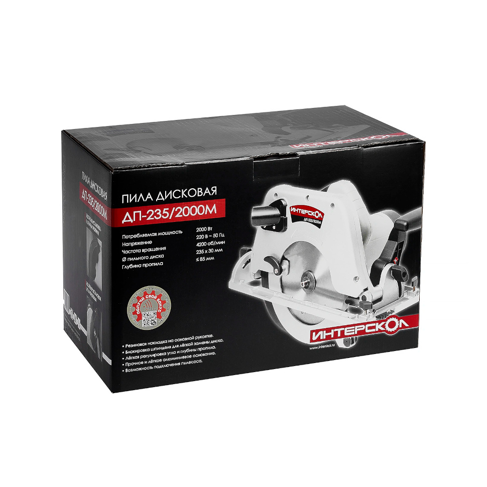 Преимущества Интерскол ДП-235/2000M (14.1.1.21):Ищете надежную циркулярку для стройки или мастерской? Дисковая пила Интерскол ДП-235/2000М станет вашим незаменимым помощником на долгие годы.