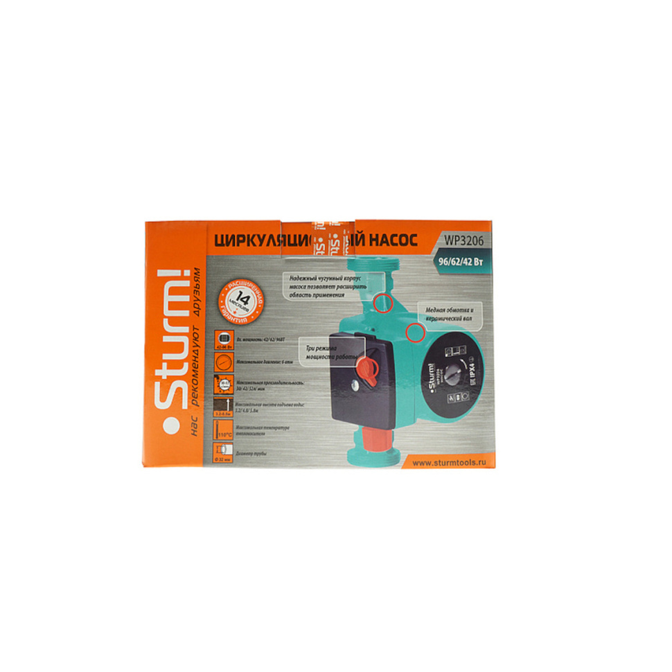 Насос циркуляционный Sturm WP3206. Установочный комплект (фитинг, уплотнительное кольцо, гайка) - 2шт. Инструкция по эксплуатации. Инструкция по безопасности. Коробка. |