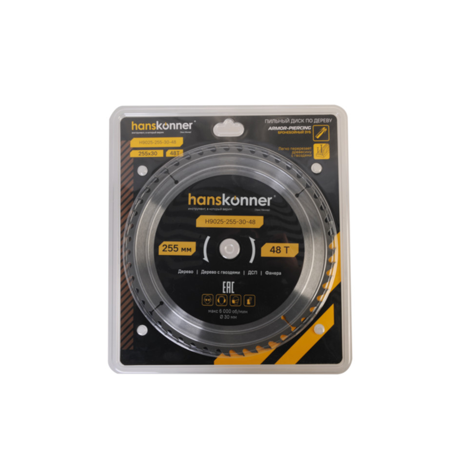 Пильный диск Хансконнер относится к серии ArmorPiercing - это значит, что он изготовлен из твёрдосплава первичного сырья, благодаря чему он способен легко перерезать даже древесину с гвоздями.