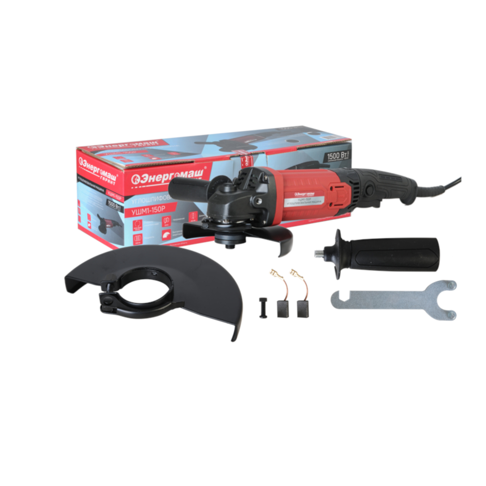 УШМ (болгарка) Энергомаш Гарант УШМ1-150Р. Быстросъемный защитный кожух. Боковая рукоятка. Фланцевый ключ. Дополнительные угольные щетки (комплект, 2шт). Болт с гайкой. Инструкция по эксплуатации. Инструкция по безопасности. Коробка. |