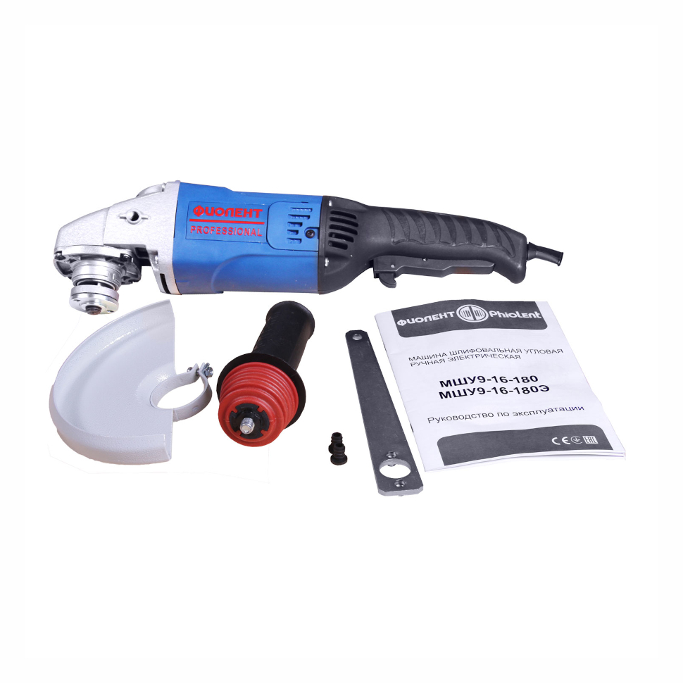 УШМ Фиолент МШУ9-16-180Э. Кожух. Дополнительная виброгасящая ручка. Руководство по эксплуатации. Ключ. Коробка. |