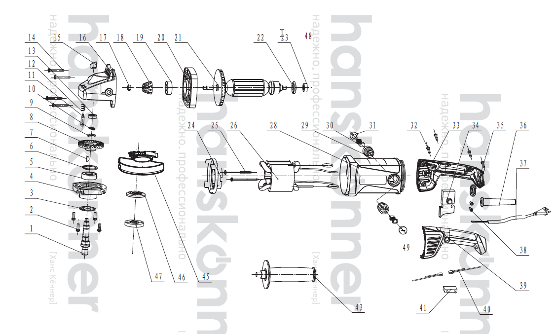УШМ Hanskonner HAG95151P. Быстросъемный защитный кожух. Боковая рукоятка. Болт с гайкой. Фланцевый ключ. Дополнительные угольные щетки (комплект, 2шт). Инструкция по эксплуатации. Инструкция по безопасности. Коробка. |