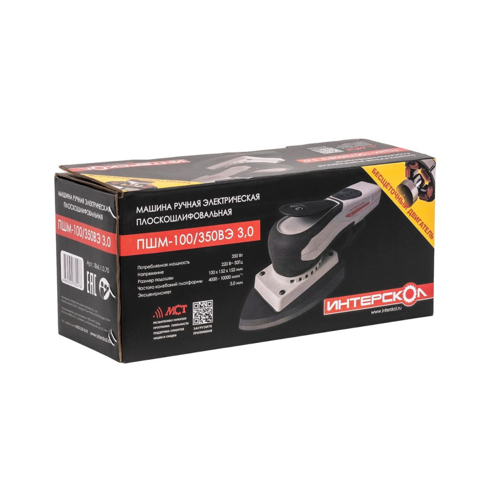 ПШМ ИНТЕРСКОЛ ПШМ-100/350ВЭ 3.0 (бесщеточная). Пылеотводной патрубок. Шкурка шлифовальная. Руководство по эксплуатации и инструкция по безопасности. Коробка. |