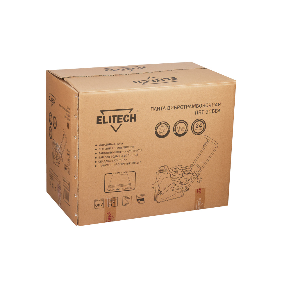 Виброплита Elitech ПВТ 90БВЛ. Полиуретановый коврик. Набор инструментов. Инструкция. Коробка. |